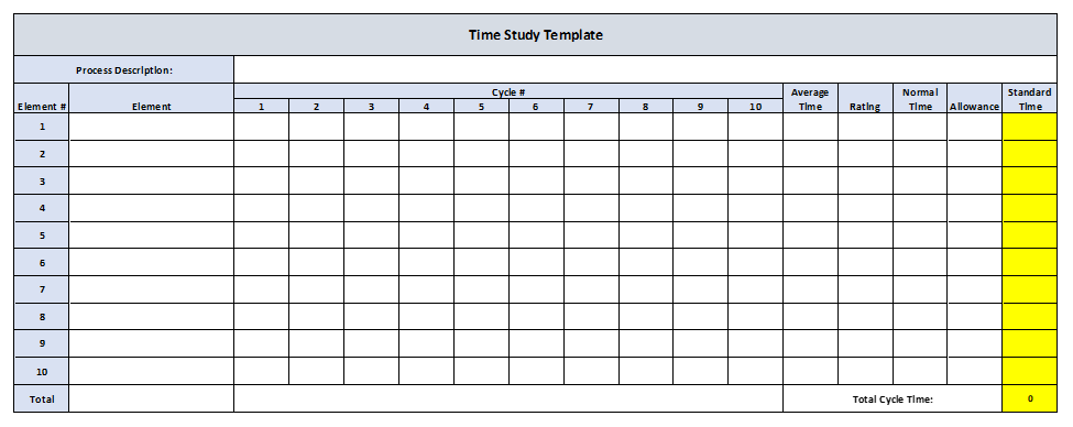 There are statistical tools that can tell you how many cycles you need, which can be highly effective. But my general rule is: the more cycles, the merrier. If you study more than 10 cycles, you are more likely to identify variabilities in the process that can impact process time. My general rule is to shoot for 100 cycles and 3-4 periodic work cycles unless the cycle is longer than 60 seconds. A good time study should take around 2-3 hours. That will give you enough samples and general knowledge of the process to develop a deep understanding of what is going on.